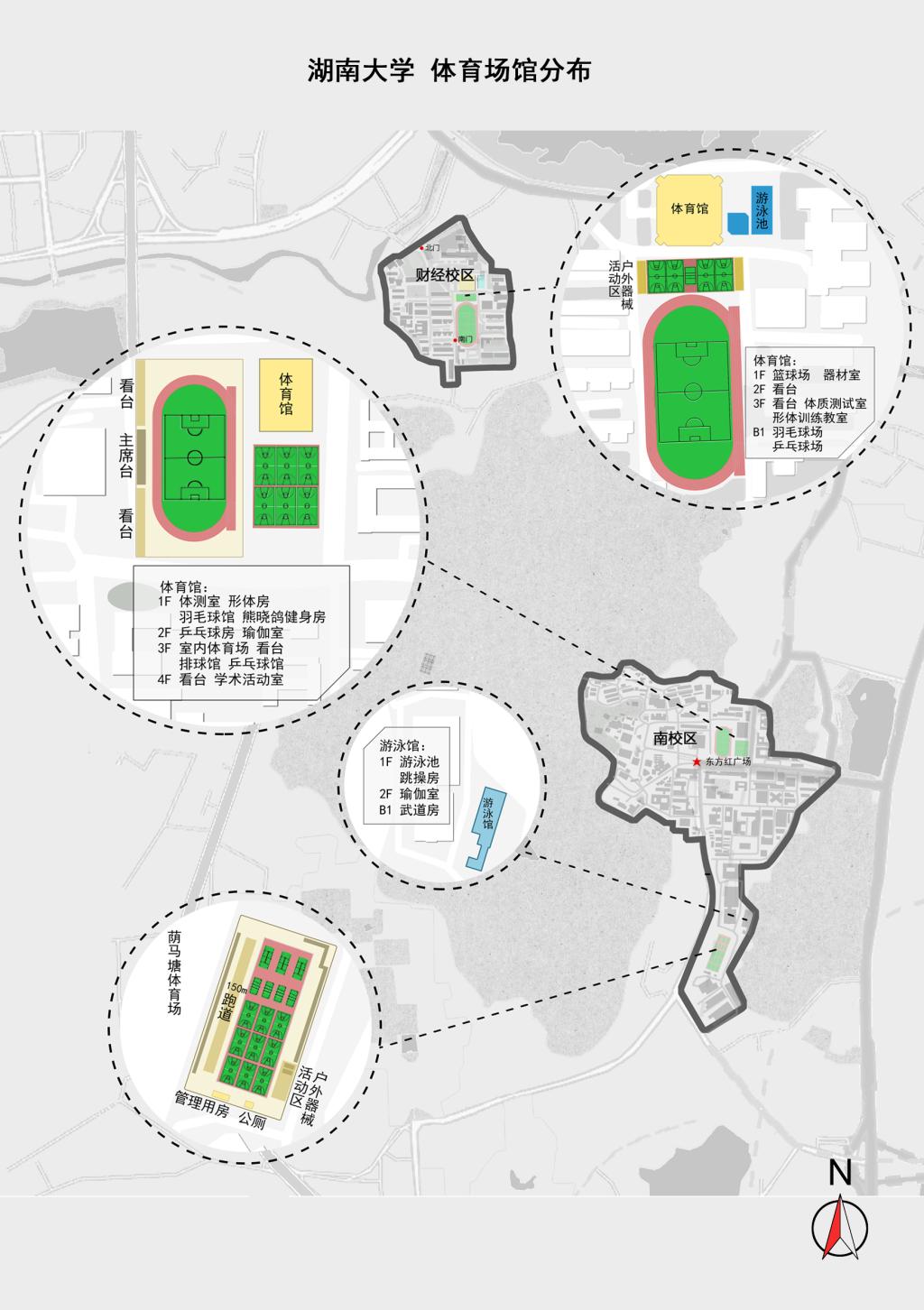 湖南大学体育场馆现有“三馆三场”,分别为南校区体育馆、财院校区体育馆、游泳馆、南校区运动场、财院校区运动场、荫马塘运动场。 运动场地分别有室外标准田径场2个,室外标准足球场2个,室内游泳馆一个、室外游泳池1个,篮球场28个,室内羽毛球场17个,排球场9个,武术房1个,跆拳道馆1个,乒乓球房3个,室外网球场5个,形体健美房5个,健身器材房2个,体操房1个,体质测试室2个,人体生理实验室2个,场地面积超10万㎡。 此外,还有环绕学校校园、岳麓山、天马山、桃子湖和岳麓书院的面积约65000㎡的定向越野场地。