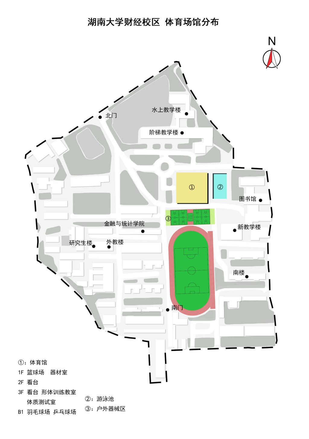 湖南大学财院校区体育馆位于长沙市岳麓区枫林二路,北面紧靠319国道、南与岳麓山北麓毗邻,地理位置优越,交通十分便利。校园内绿树成荫,花团锦簇,四季飘香,被誉为省级“园林式单位”。 体育馆1996年建成投入使用,占地面积2500㎡、建筑面积7000㎡,体育馆内设有标准篮球场1个、乒羽房1个(含8片羽毛球场和17片乒乓球场)、形体房1个、健身房1个、体质测试房1个。 体育馆外设有篮球场4个、排球场1个、田径场1个、室外标准游泳池1个。
